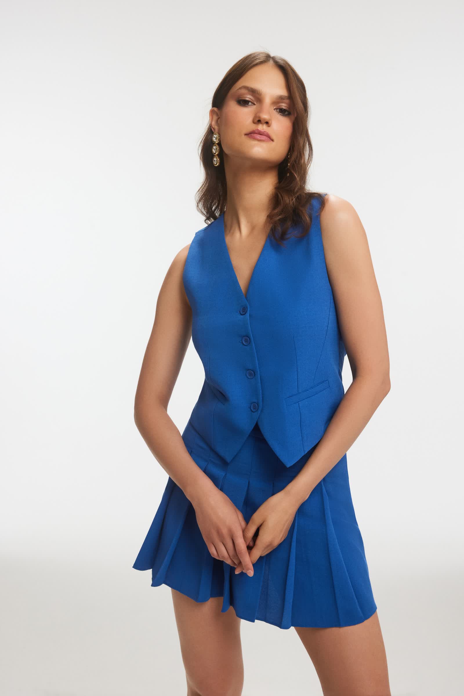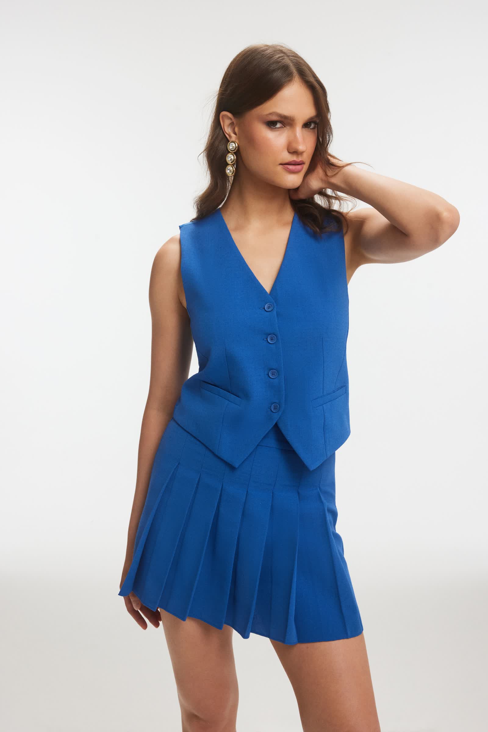 AMORY Keten Yelek ve Pilili Lacivert Etek Takım