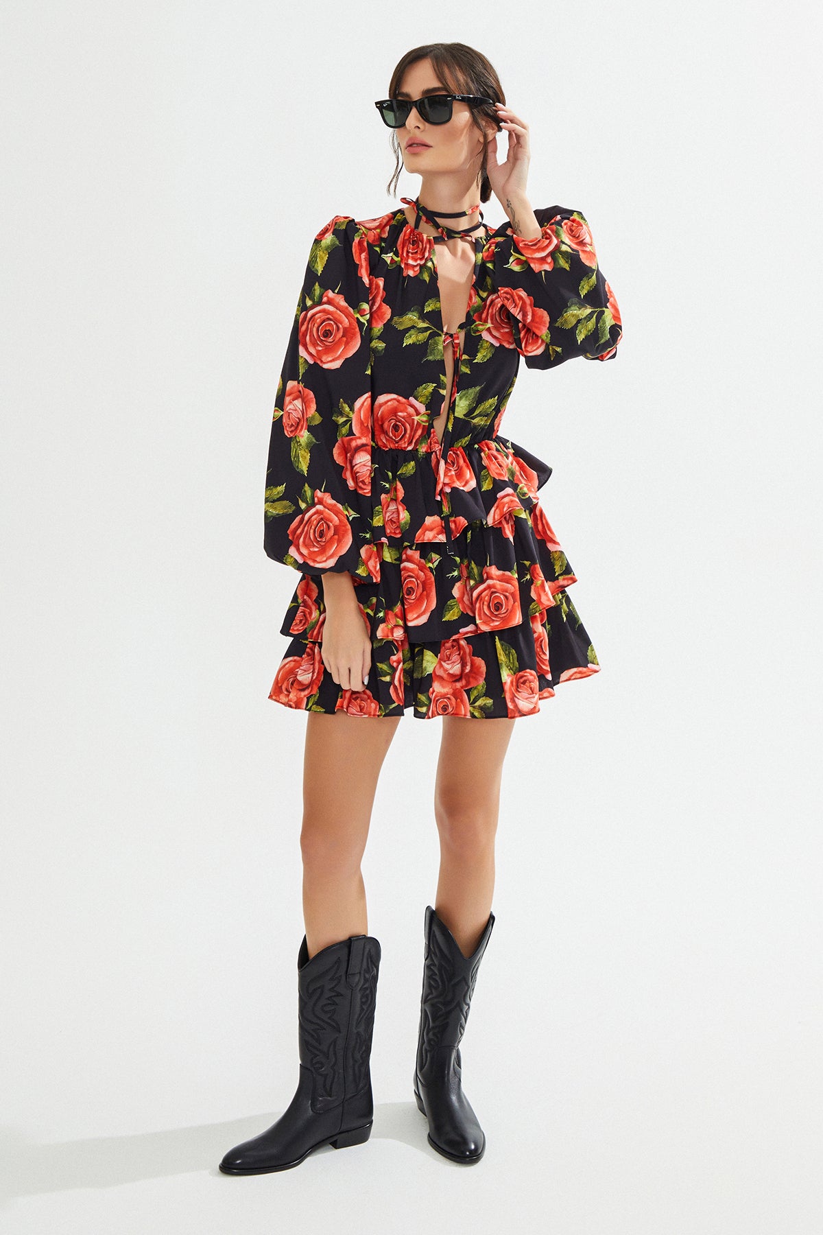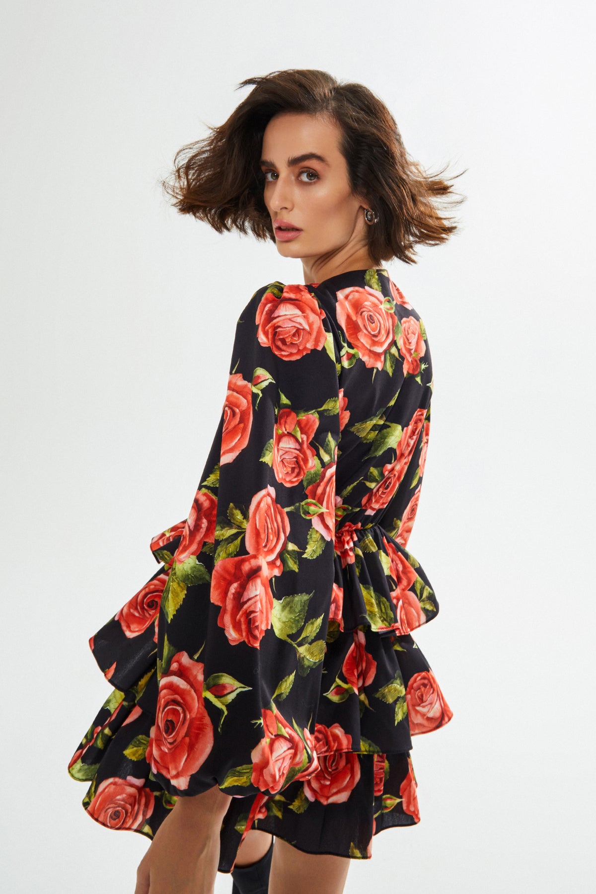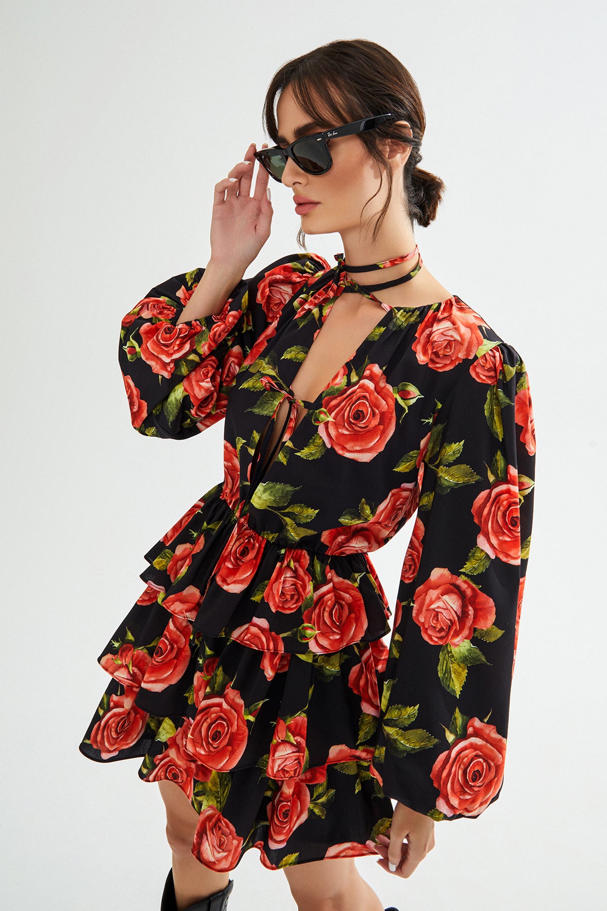 MARIA Gül Desenli Fırfırlı Mini Elbise