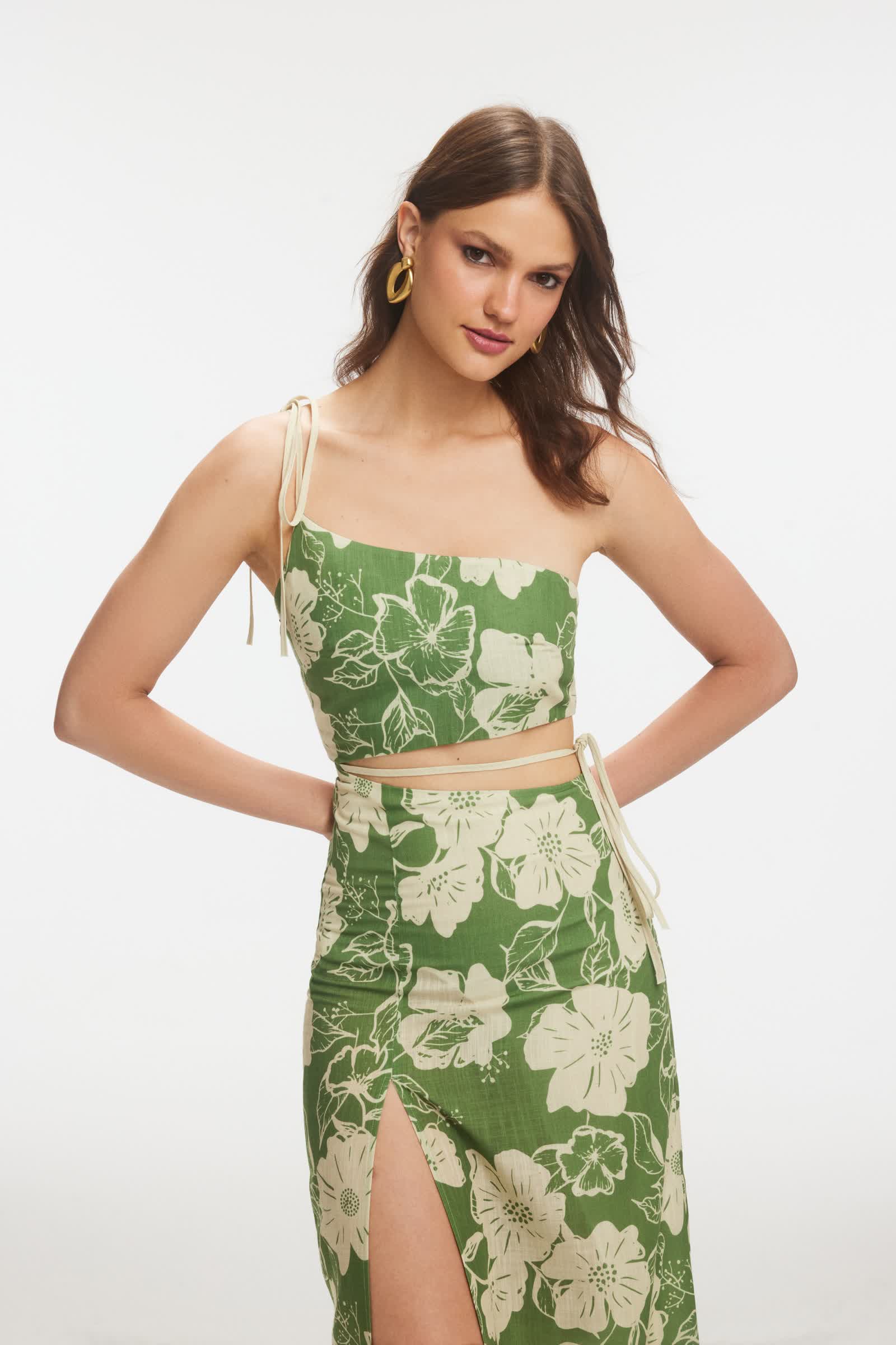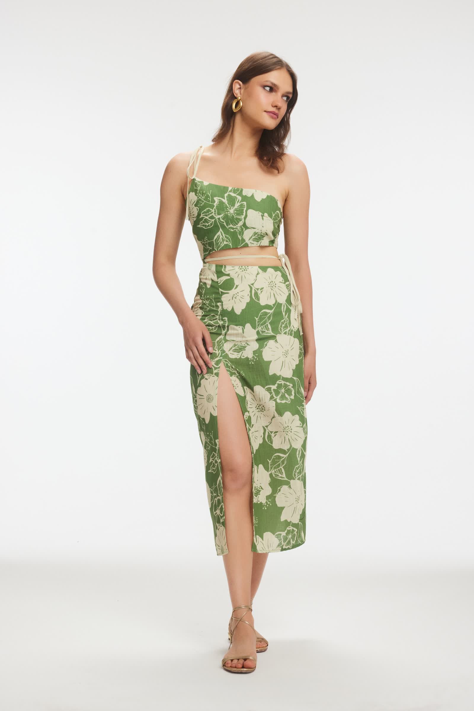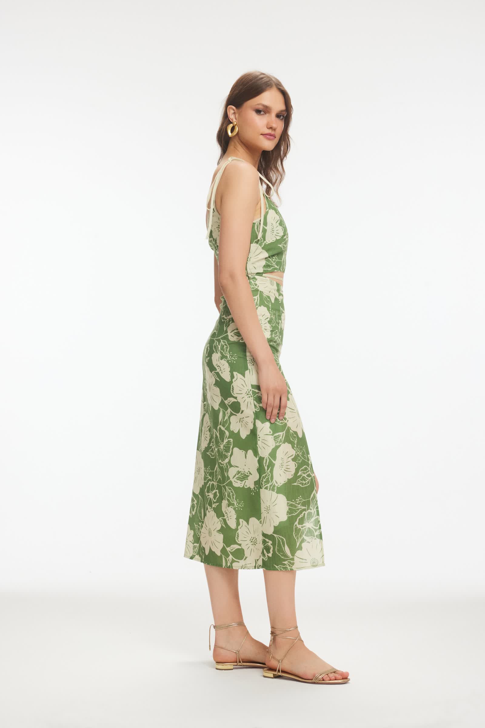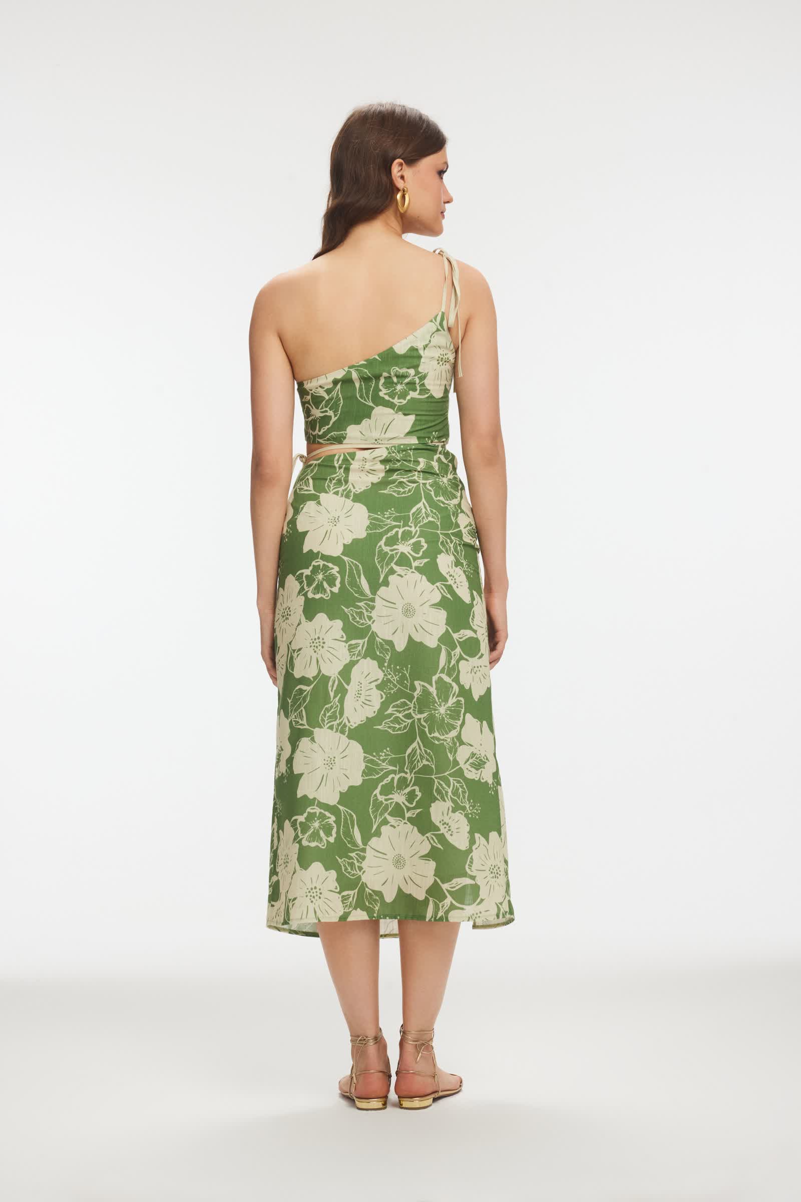 OSSEI Çiçek Desenli Keten Haki Midi Elbise
