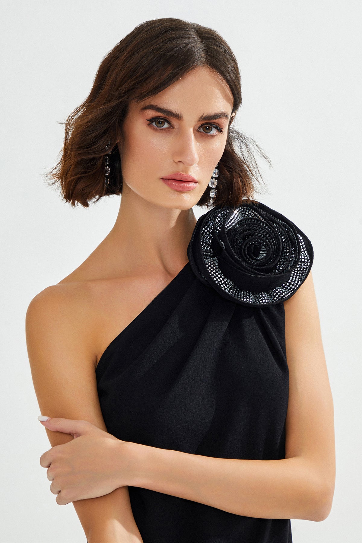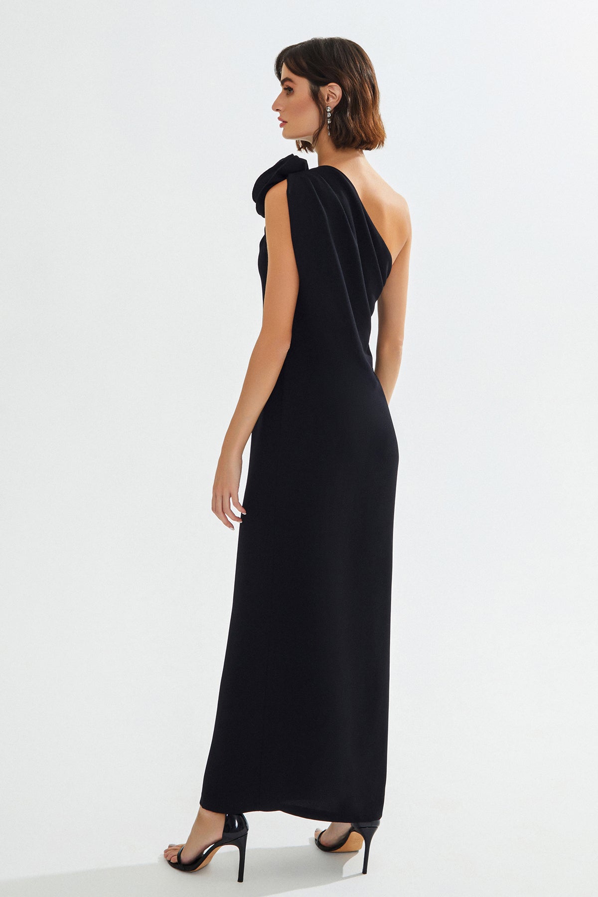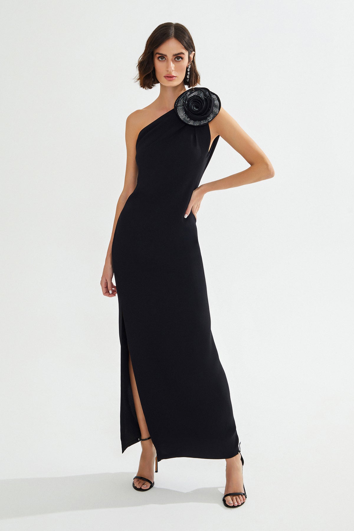 GENNIE Tek Omuz Çiçek Detaylı Siyah Maxi Elbise