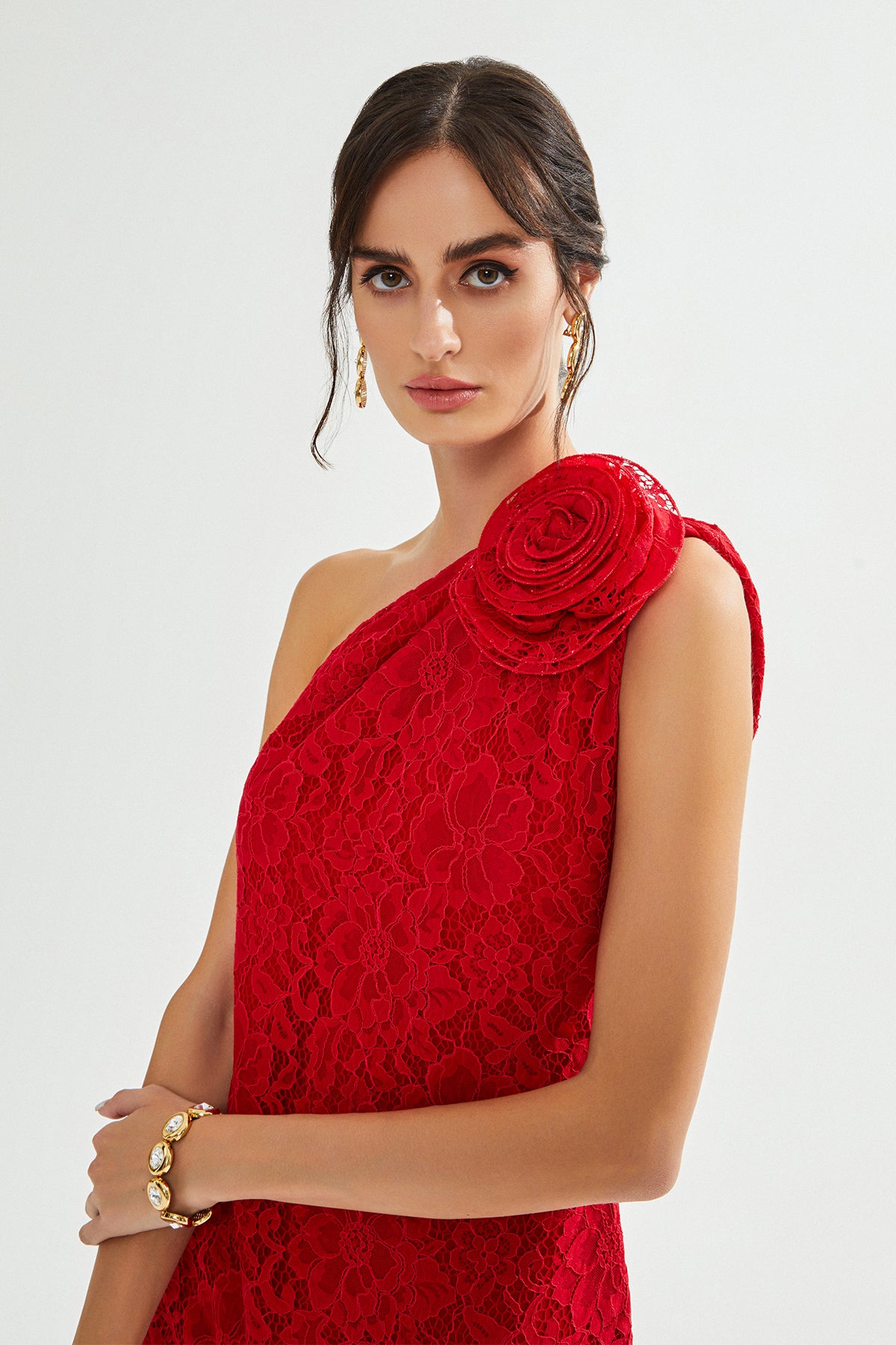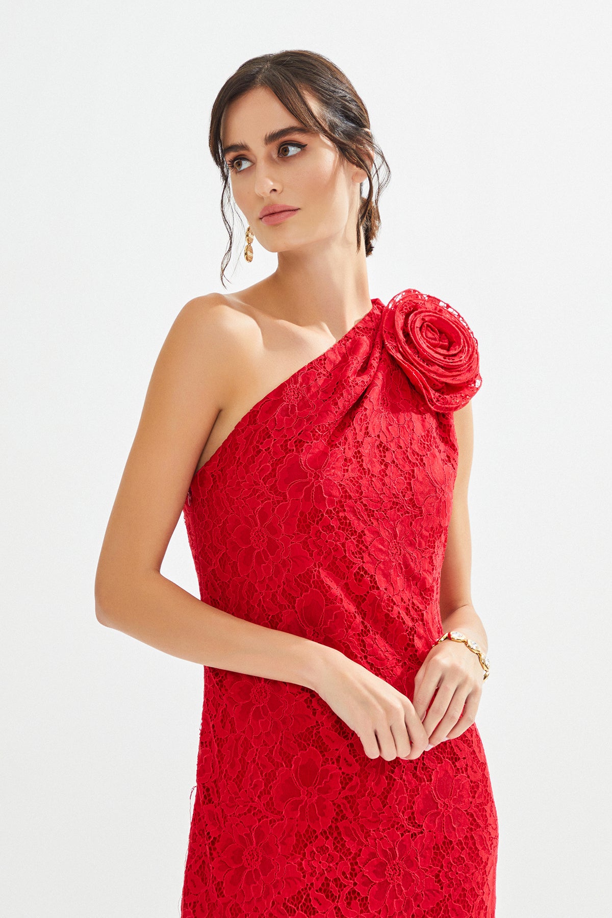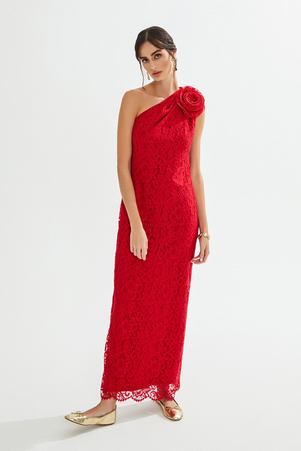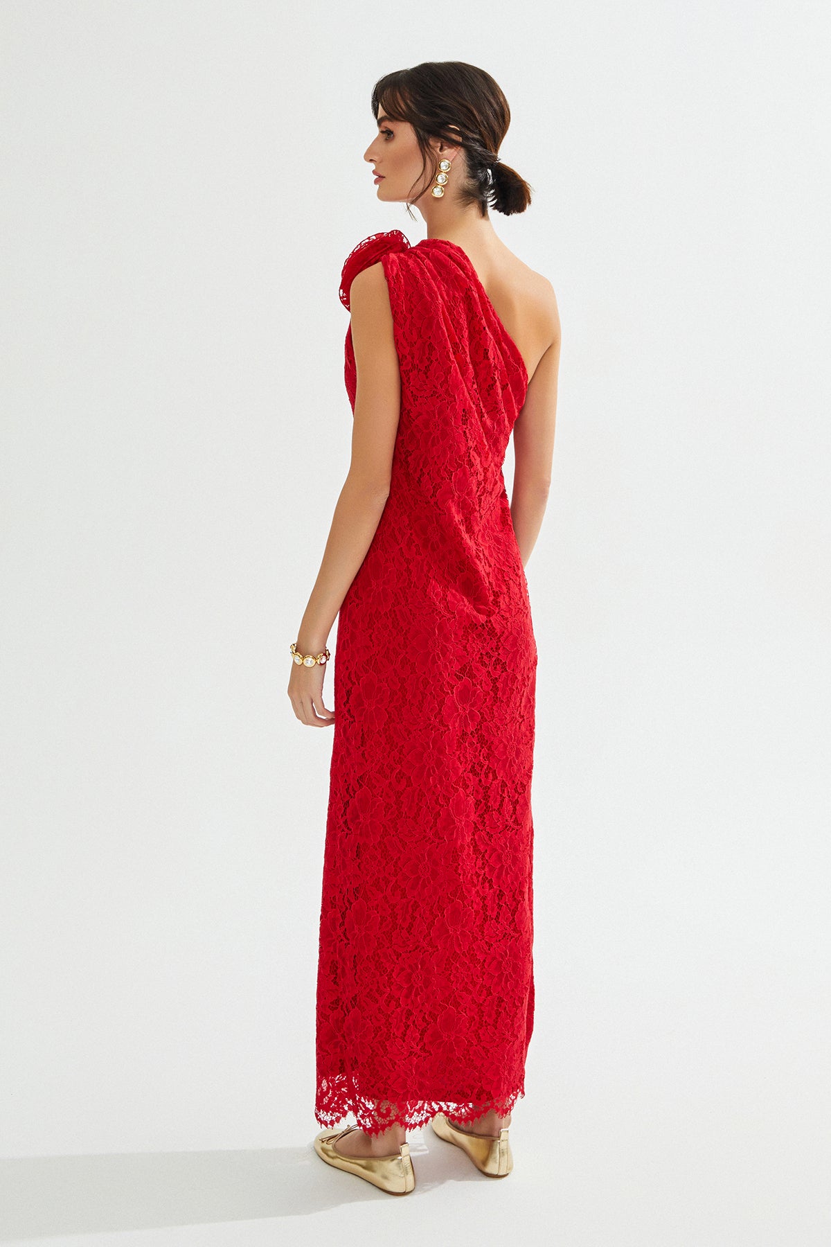 GENNIE Tek Omuz Kırmızı Dantel Maxi Elbise