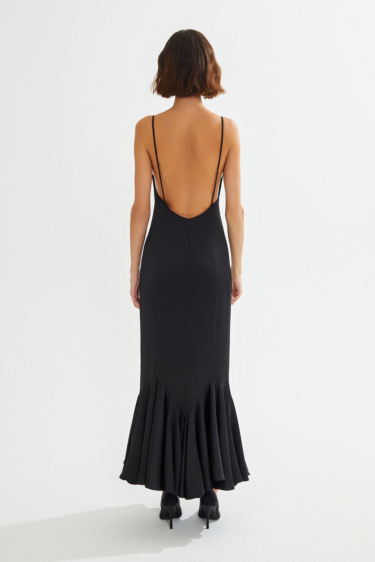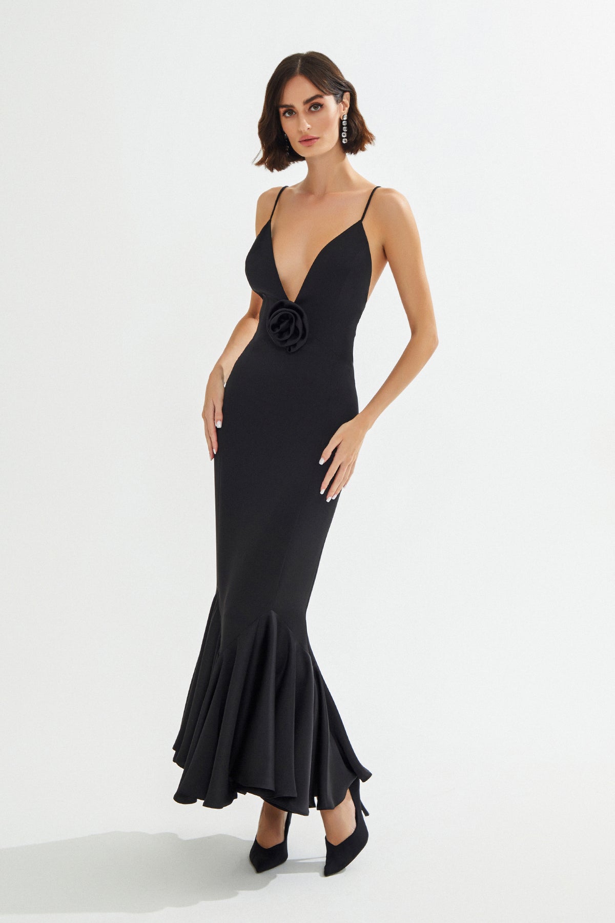 GIORGIA Gül Detaylı Midi Siyah Elbise