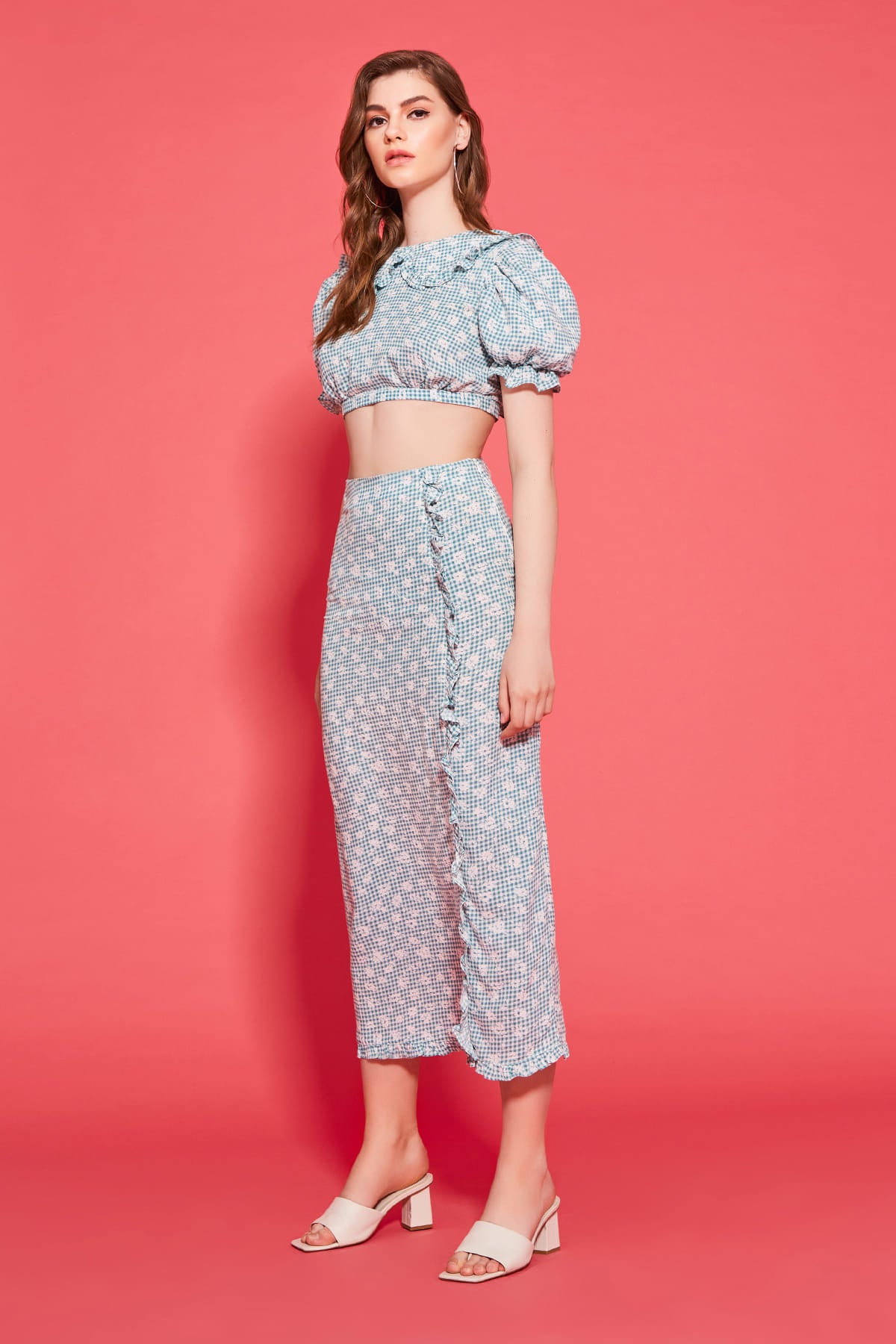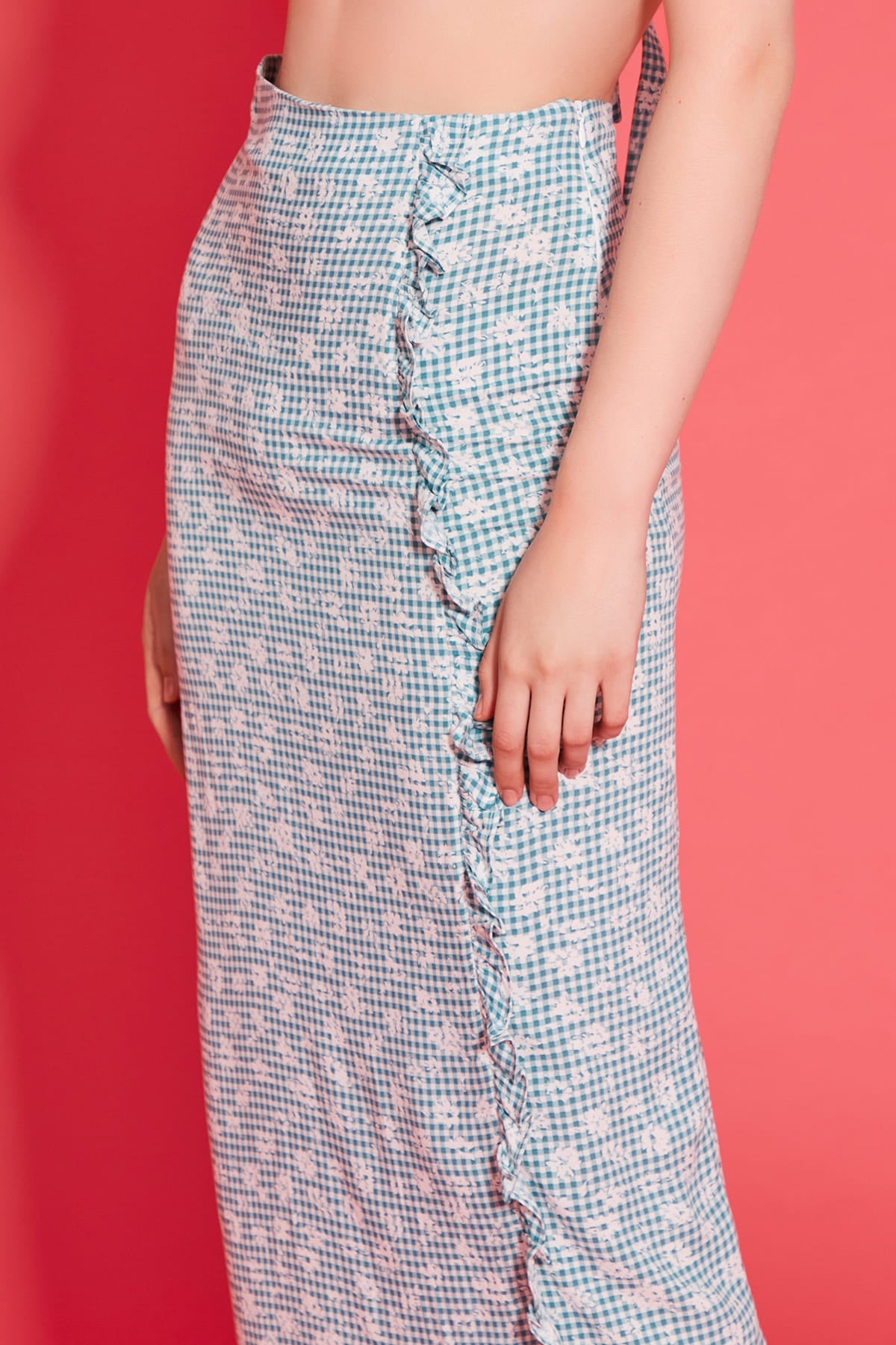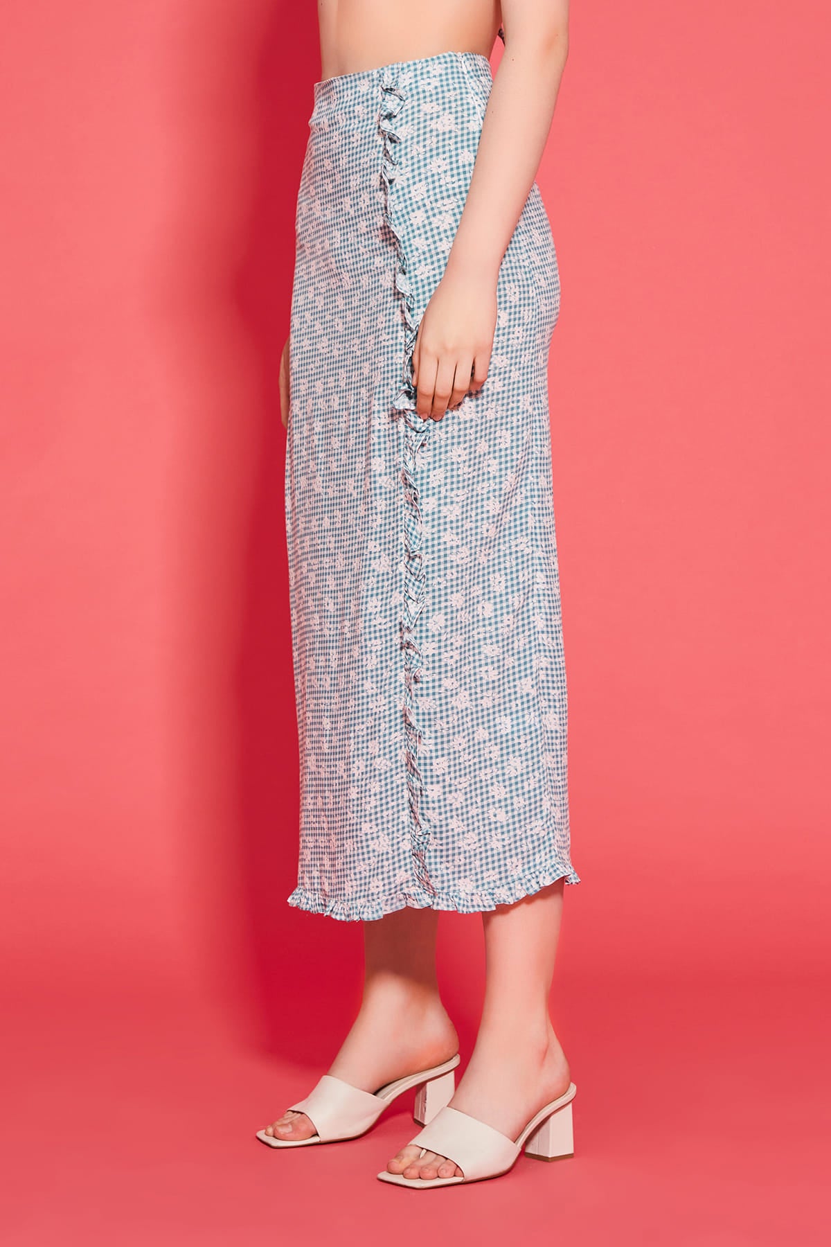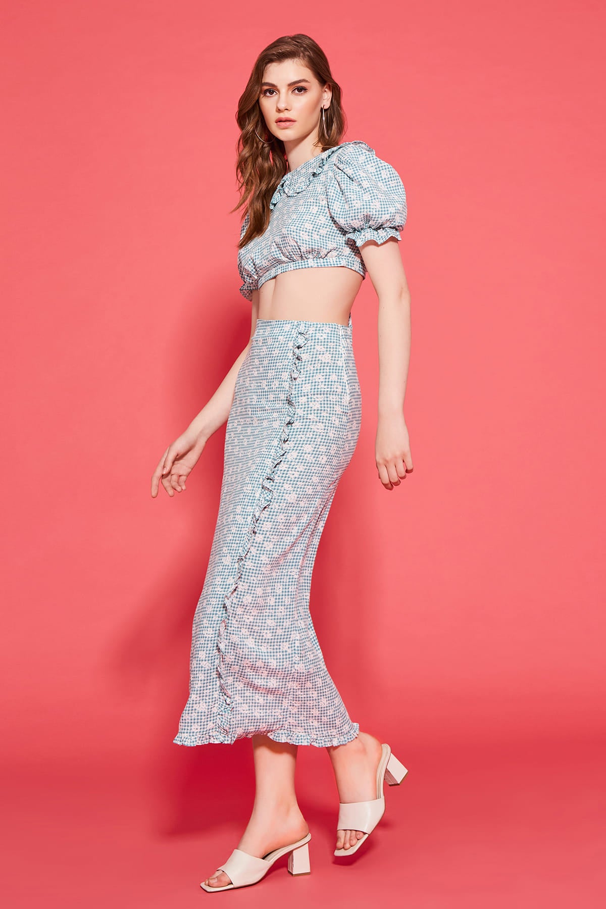 JADE Kare Desenli Fırfır Detaylı Midi Etek