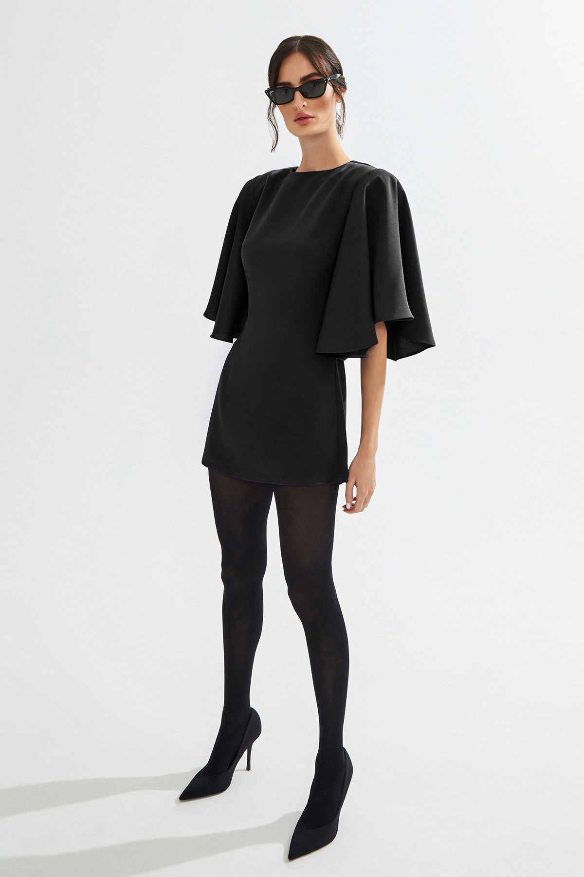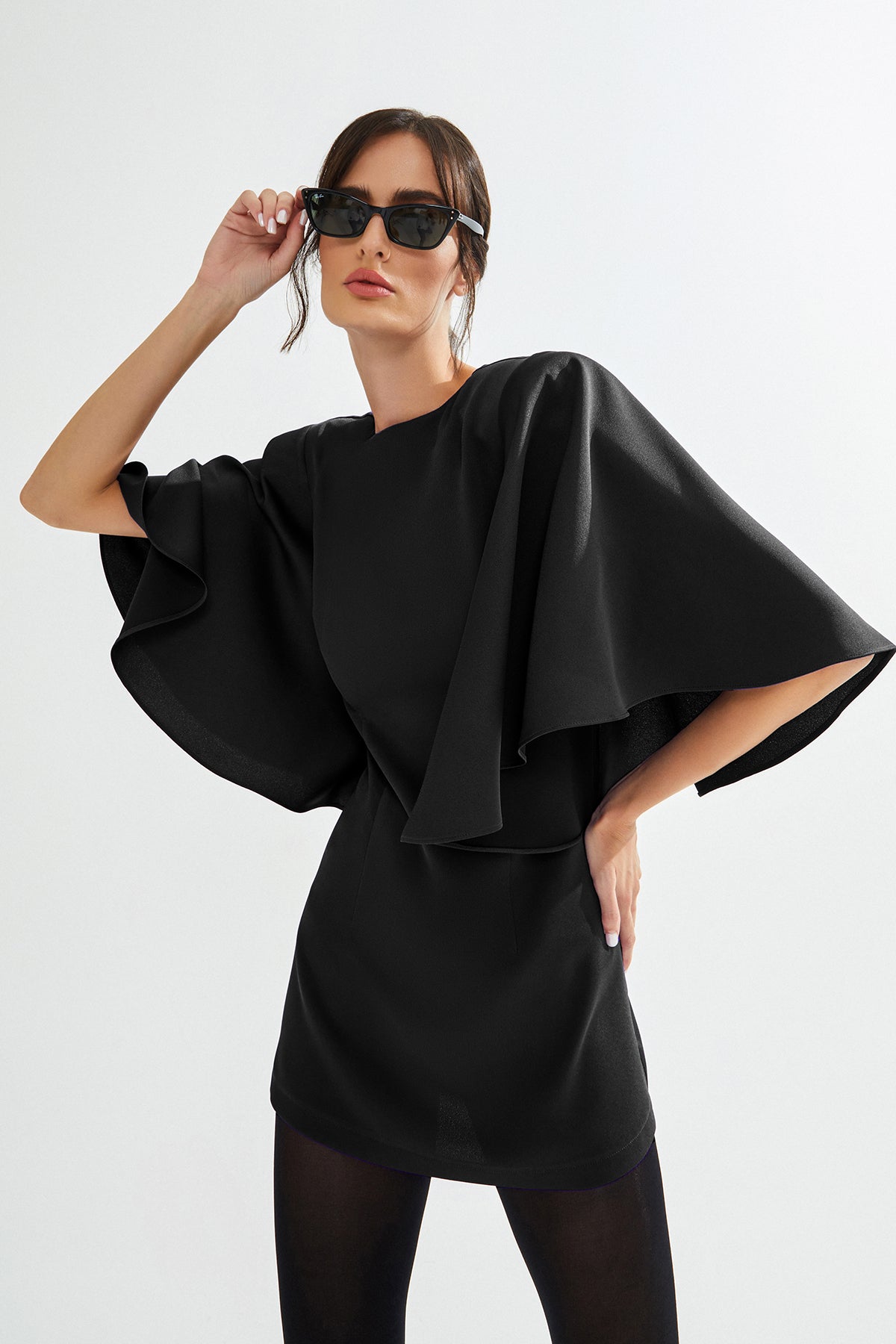 MARIAN Pelerin Detaylı Mini Saten Siyah Elbise