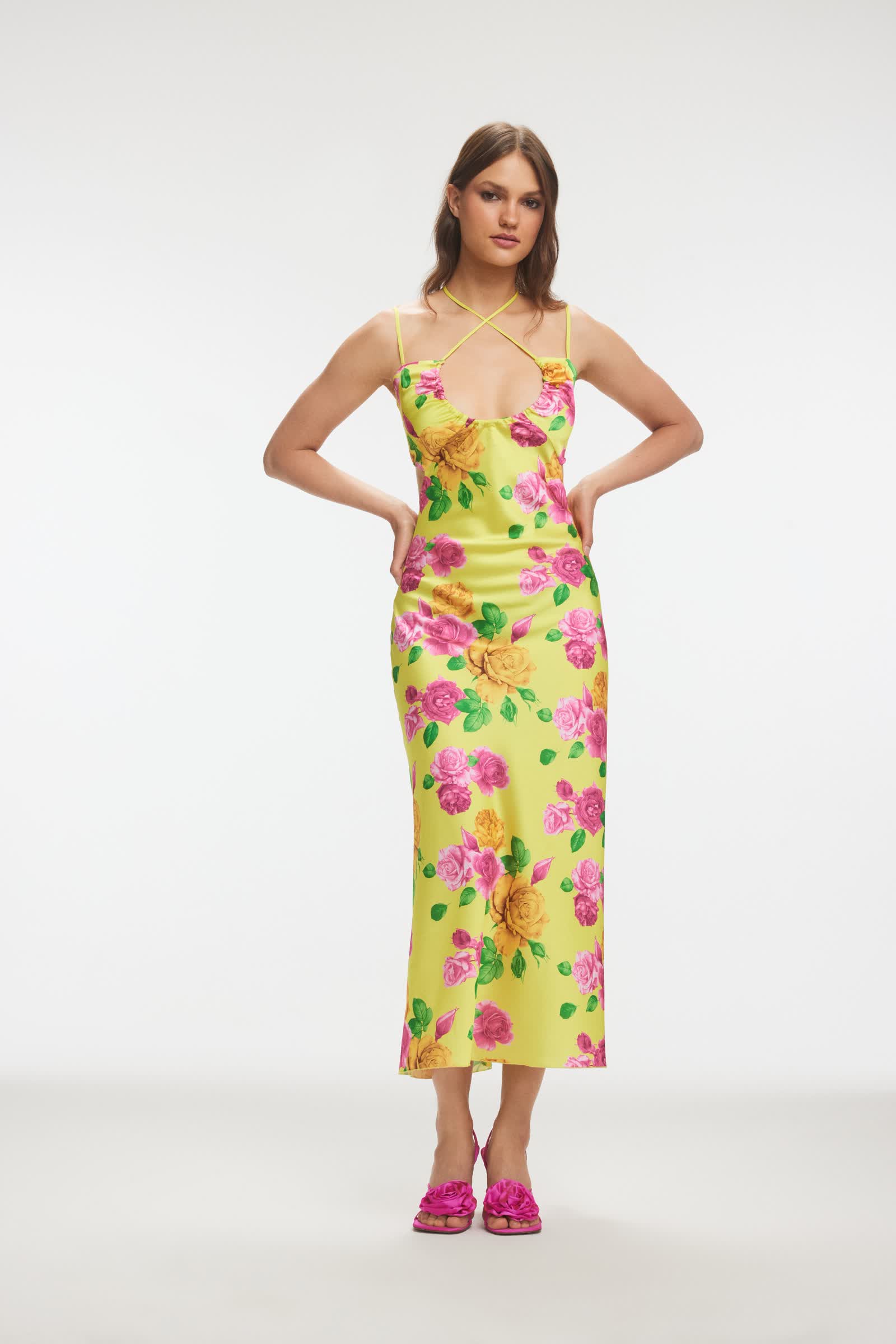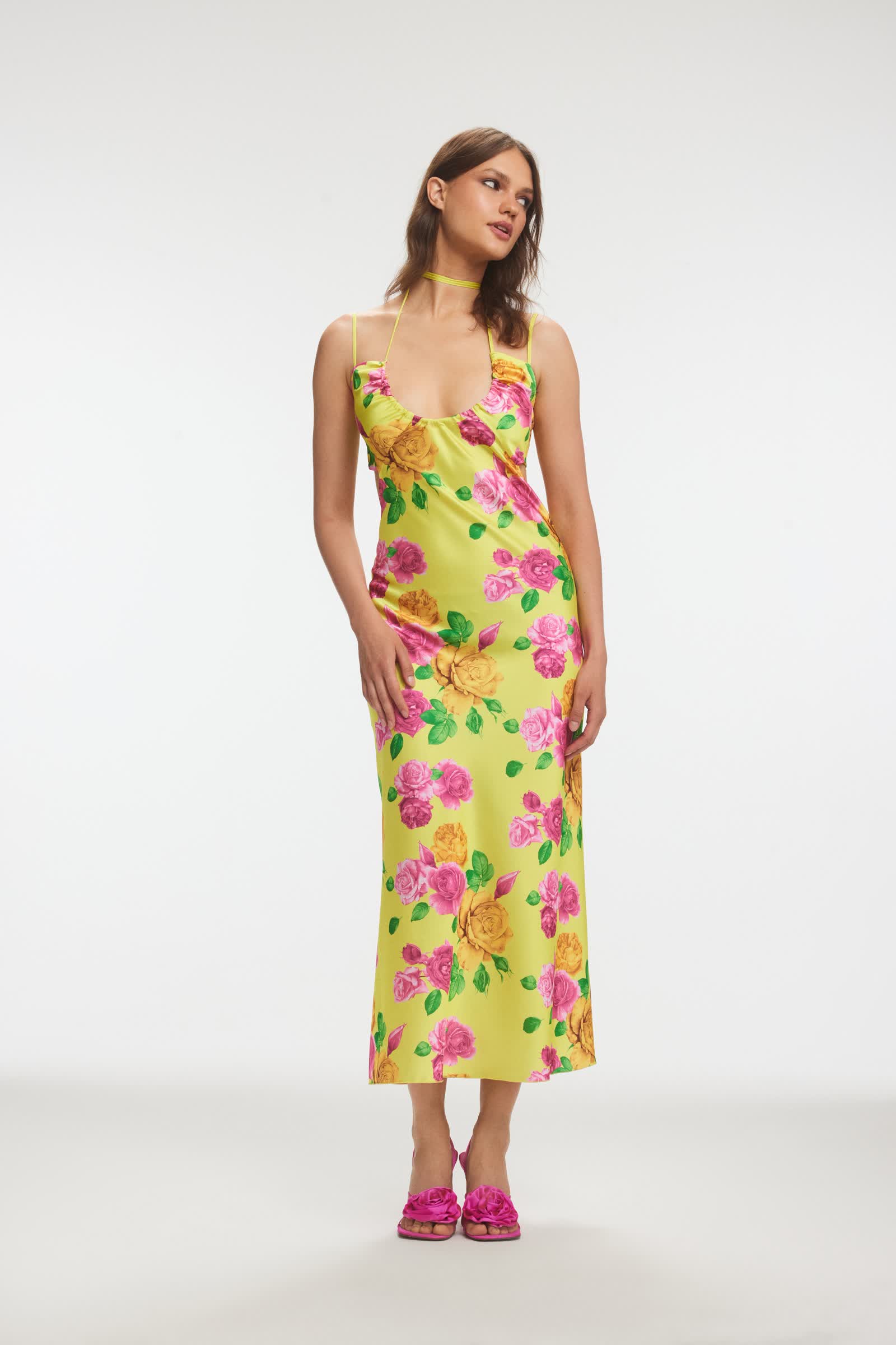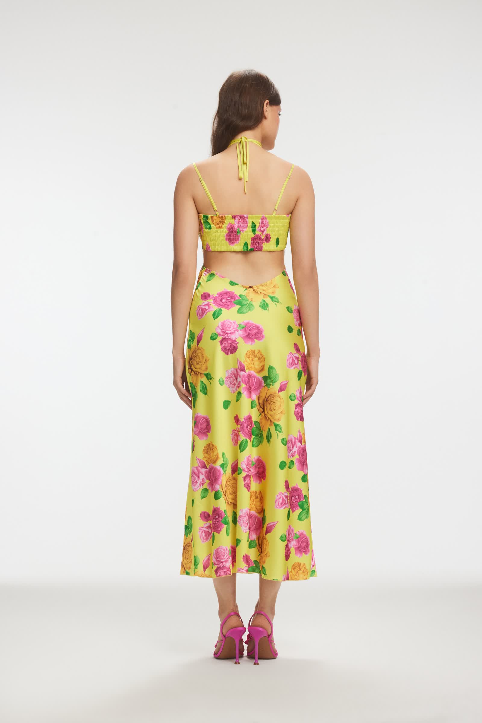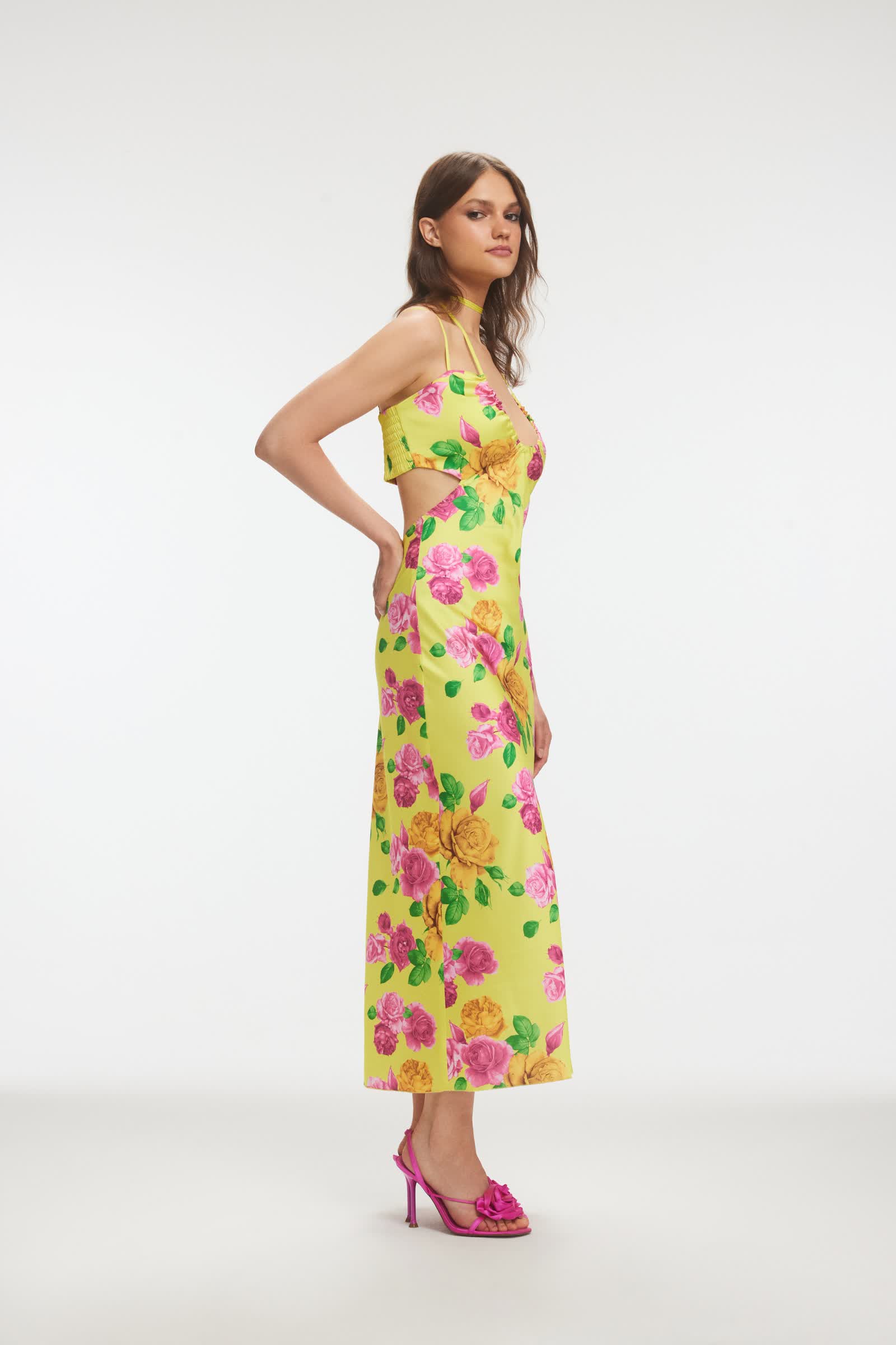 ROWEN Büzgülü Sarı Çiçek Desenli Midi Elbise